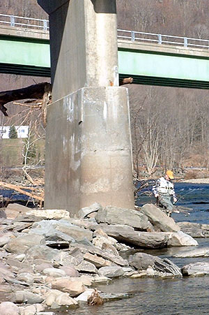 I've fished once since then, and the damage and debris along the shoreline was pretty amazing. Take a look at this picture and notice the tree washed into the bridge abutment. That's quite a ways above that angler's head (Deryn LaCombe).