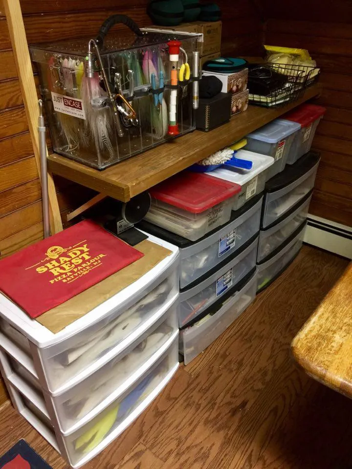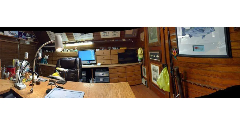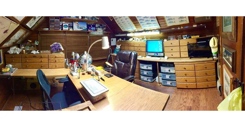 The birthplace of a lot of innovative fleye designs. Bob writes "Tying room is designed to hold my tools, hooks, eyes, TUFFLEYE, and LIMITED materials. I use a small box to hold materials I will need to do certain type FLEYE. You can see it on the table. Keeps a mess to a minimum. Some BUCKTAILS, feathers and flash are located in large drawers along the wall. Computer, tv and video equipment along wall also. Storeroom holds all the bulk of materials. Fishing equipment, bags, luggage, etc. coffee machine, little fridge (not in room yet), lots of books. BTW, forgot to mention rods along the ceiling and in slots along a wall and in hidden cubby holes."