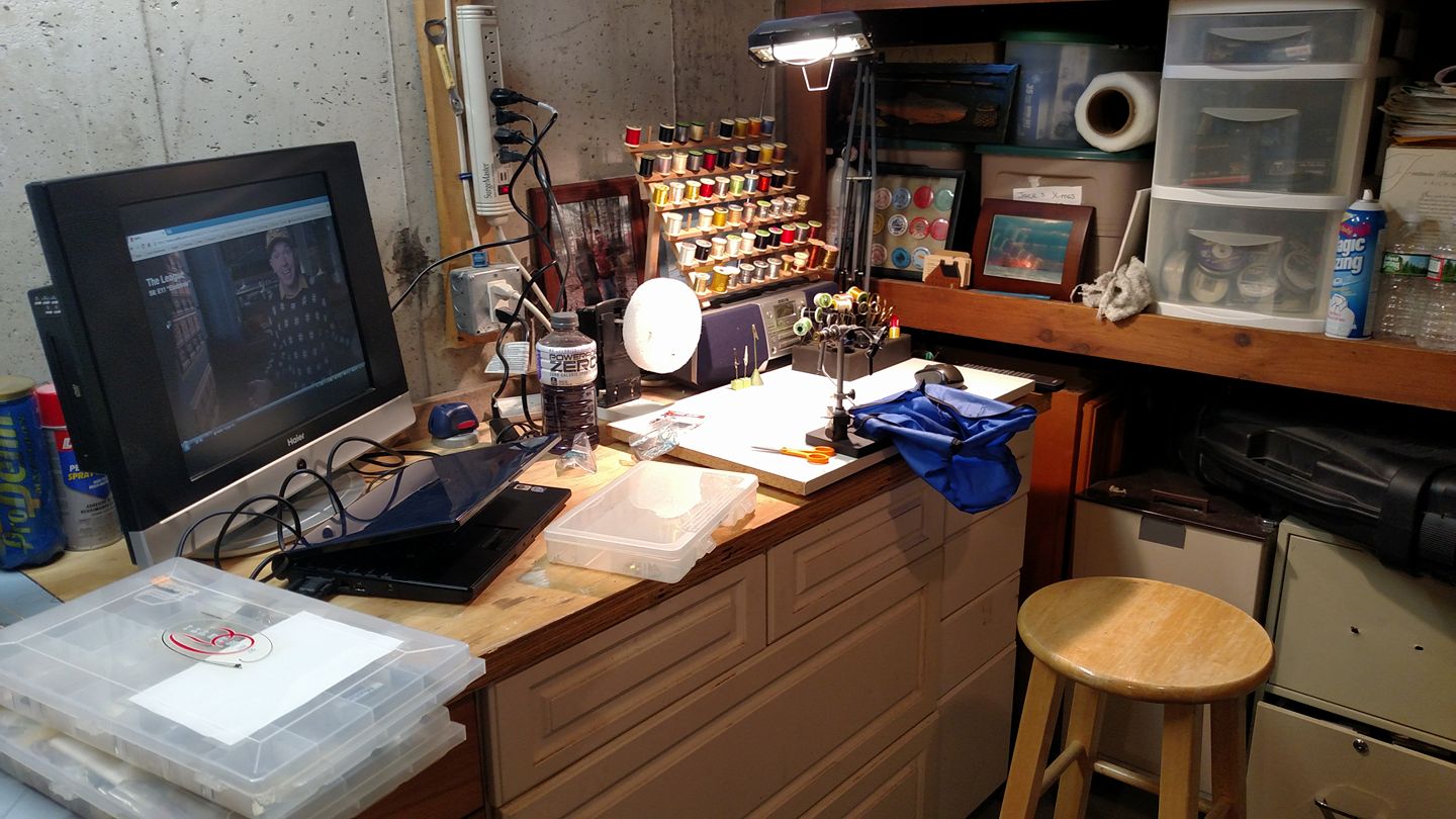 When my Fiance and I were looking at a new home to purchase, we saw this house. It was being converted into an in-law apartment in the basement. The first thing I noticed was the old cabinets that were already in place. I quickly dubbed this are "Mine". The drawers are filled with tying supplies, I have a TV hooked up to my laptop, so I can stream Netflix or check out the latest patterns people post to Facebook or Instagram. There is also a radio for listening to tunes while I tie away. I still need to organize the shelves a bit, but so far, it's my own slice of solitude.