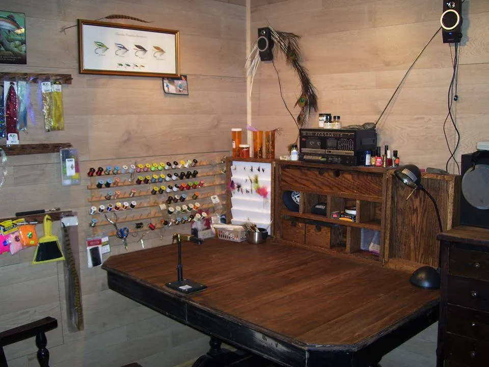 l am so lucky that the wife lets me have a room in the basement and l got a big dinning room table to tie on, lots of place for storage (she managed to take up space with her stuff). When l start tying l am on a roll. l tie in 10's so l can have the group tied in about 1.5 hours and then l am on the the next group... NOW for you new tyers. When you finish tying a fly put all your stuff away and then go to the next fly. Don't be like me and leave it out. So far today l have spent 5 hours cleaning off the desk and l am still not done... putting all the hooks, beads and materials into there rightful place is taking forever.