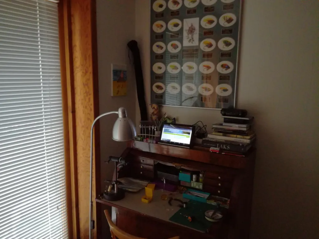 I tye in the bedroom, so I need a lid on my tying station to avoid feathers and hair all over the place. I used to tye on a regal copy but having to locate a size 18 hook, that was shot out of the vise and onto the bed made me buy my current vise. I found my roll top for a mere 300,- dkr.,the seller citing the tableplate being stuck, took a me exactly thirty seconds to make it unstuck, nice. The small drawers hold hooks, beads, eyes, thread and assorted odds and ends and I have one large drawer for hair and fur and another for feathers, leaving the last one for "miscellaneous