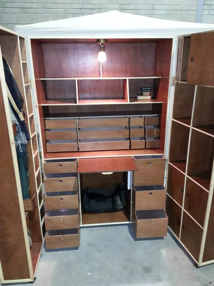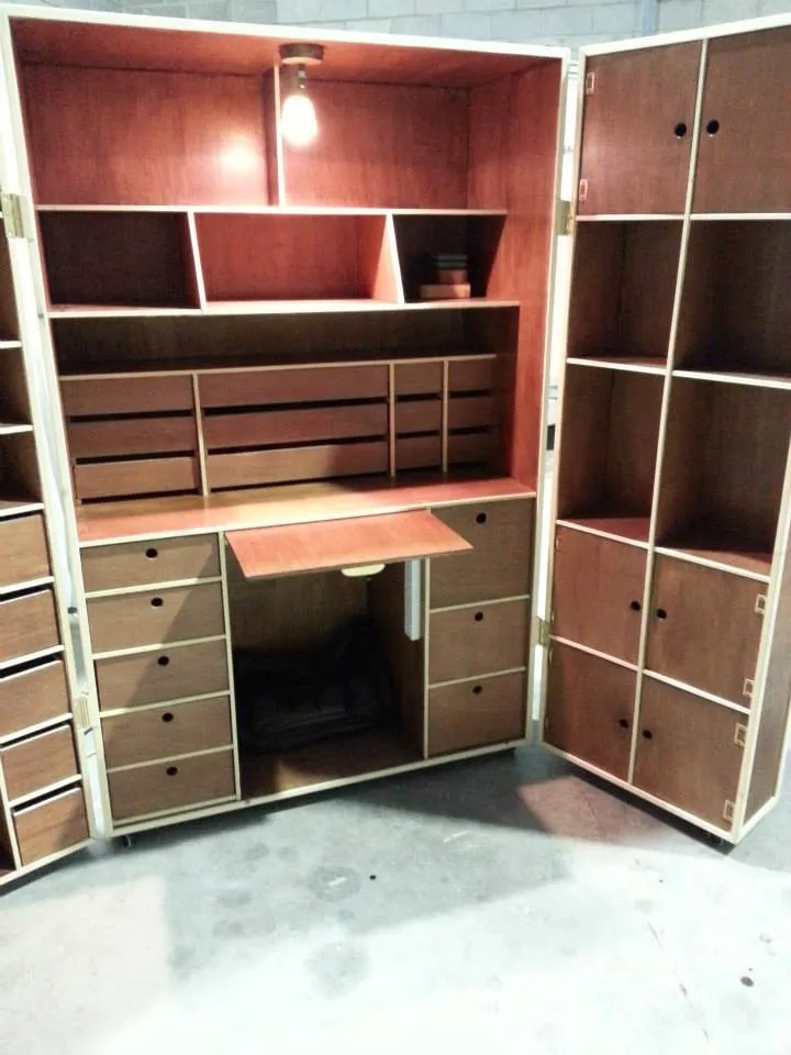 Basic Idea was to have a separate room for fly tying even if there isn't a separate room available in the house. The dimensions are width 110cm, depth 70cm and high 175cm ... with doors fully open it has a width of 220cm. I designed this one while I was building it ... so it took me a couple of weeks ... I guess I could make a copy of it working 70 hours (most time is down to sanding ... again and again)