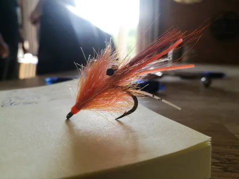 | Tail (thorn/antennae) | Small bunch of orange bucktail and a large, red golden pheasant shoulder feather |