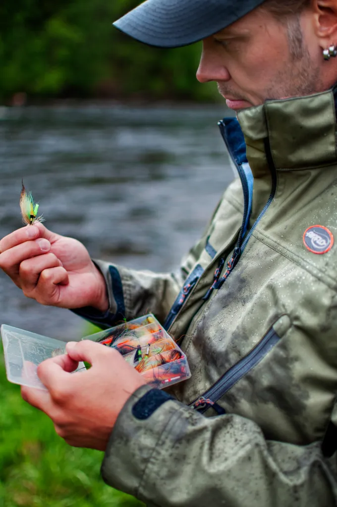 A fisherman is picking a fly for rainy weather. His serious face reflects the difficulty in picking the right pattern. If you ask me he is about to make a mistake…