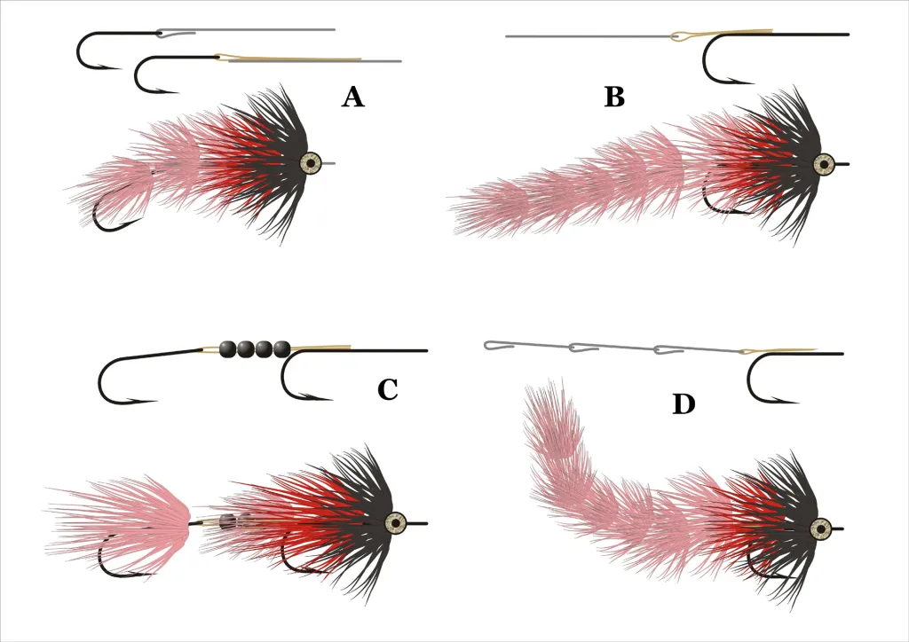 Some of the ways to tie an articulated fly: A: Front shank and rear hook, B: front hook and rear shank, C: Two hooks and wire, D: Game Changer style (with a spine)