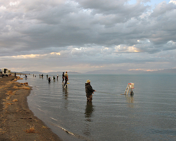Member of San Jose flycasters lining up at the nets. Most use shooting heads with a wolly bugger. The ladders are to get your b** out of the frigid water and to help you spot the schools of trout cruising by.